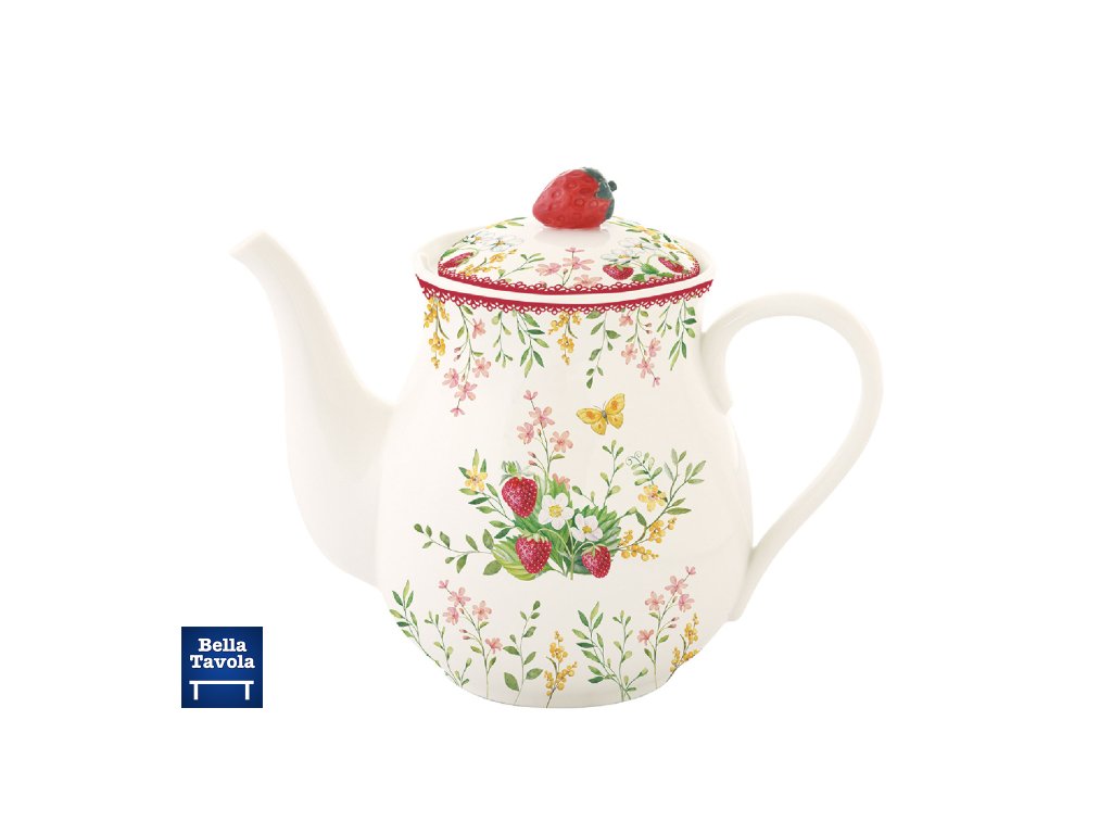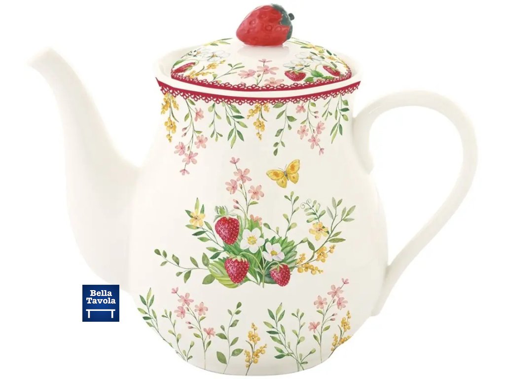 Nádherný porcelánový čajník 900 ml s detailom jahôdky z kolekcie Jardin des Fraises od talianskej značky Easy Life. V darčekovej krabičke