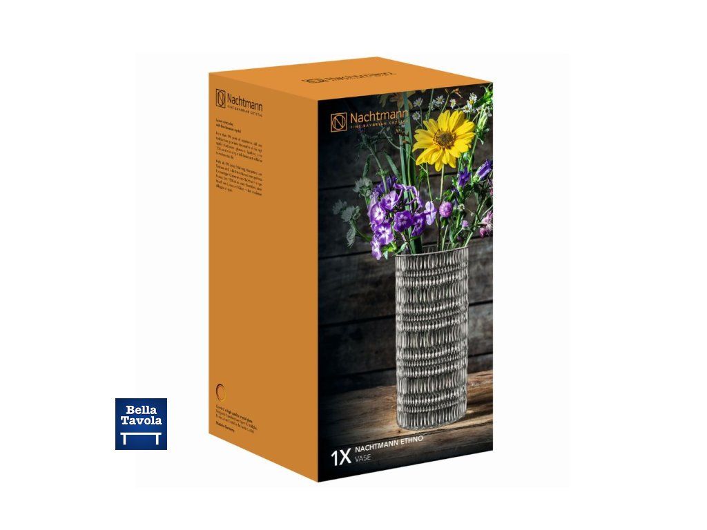 Ethno je elegantná krištáľová kolekcia tanierov, mís a doplnkov stolovania. Kolekcia je charakteristická tým, že všetky jej produkty - vrátane tejto vázy - majú rovnaký vzor. Táto váza od NACHTMANN vyrobená z brilantného krištáľového skla, ktorá je všestranná svojou formou a funkciou, je zároveň sofistikovanou lampou typu hurikán. Vďaka svojej modernej siluete a žiarivému lesku dodáva nádych luxusu každému prostrediu – či už je naplnené čerstvými kvetmi alebo jemne osvetlené sviečkami. Vysokokvalitné krištáľové sklo krásne odráža svetlo a vytvára dekoratívne prvky. Ideálne pre sezónne aranžmány, štýlové prestieranie alebo útulné večery doma.