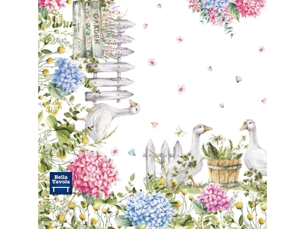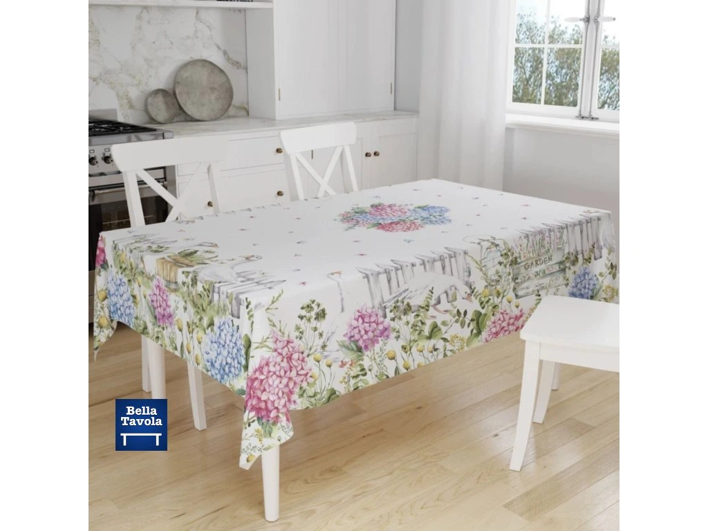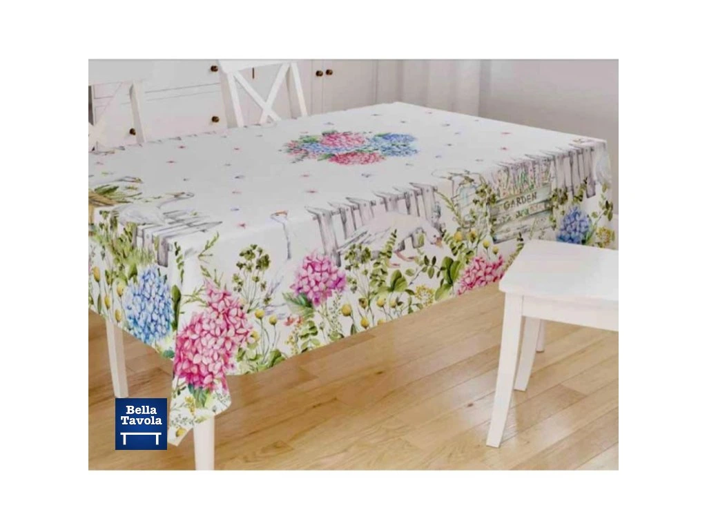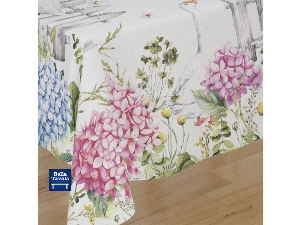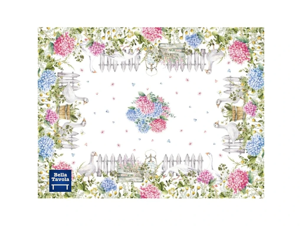 Bavlnený obrus 140 x 180 cm s motívom Hortenzie a húsky od talianskej značky Vingi Ricami