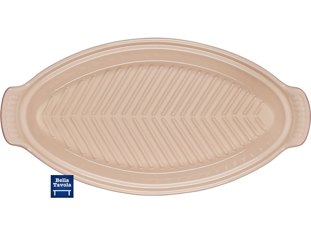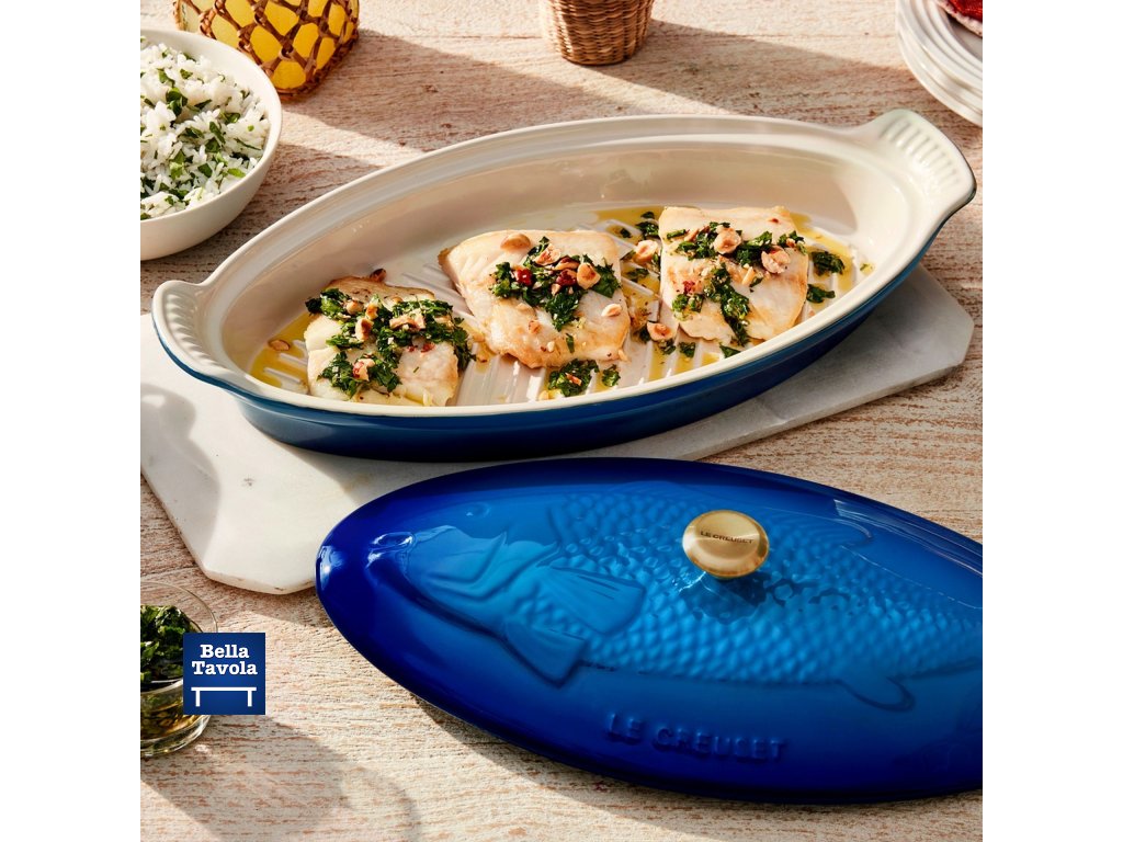 Pekáč na ryby Le Creuset Fish Baker odstraňuje záhadu prípravy lahodných rýb doma. Krásny oválny pekáč má dokonalú veľkosť na varenie v pare, pečenie a grilovanie všetkých druhov rýb – či už pripravujete lososa, filety z tresky alebo pstruha, každý recept bude uvarený k dokonalosti. Drážky na dne pekáča umožňujú rovnomerné varenie. Tento pekáč je vyrobený z najkvalitnejšej keramiky a je vyrazený elegantným motívom ryby pre pôsobivú prezentáciu z rúry na stôl. Ergonomické rukoväte umožňujú pevné uchopenie.