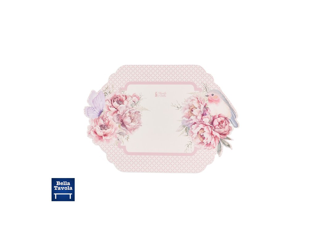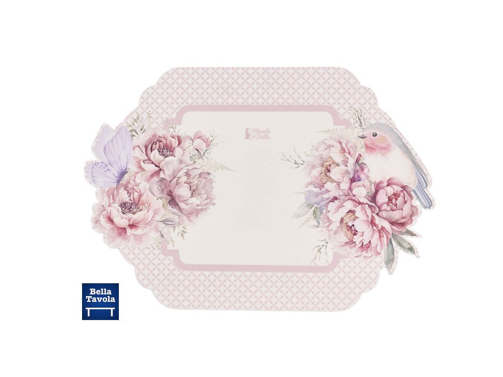 Jemné a praktické, vinylové prestieranie Vtáčik s kvetom z kolekcie Fiorirà ozdobí váš stôl romantickou eleganciou: púdrovo ružové pozadie s geometrickým mikrovzorom, okraj v tvare oblaku, kytica ružových pivoniek, fialový motýľ a sladký akvarelový vtáčik. Rýchlo sa čistí a je ideálne na ochranu dosky stola bez straty štýlu.