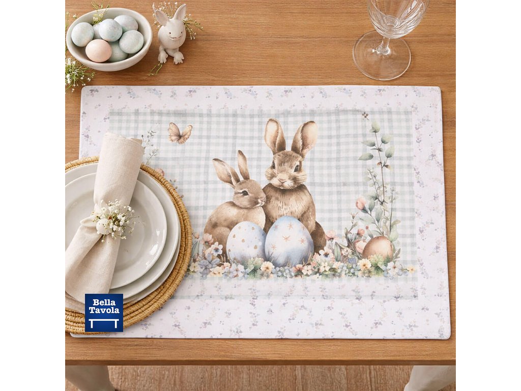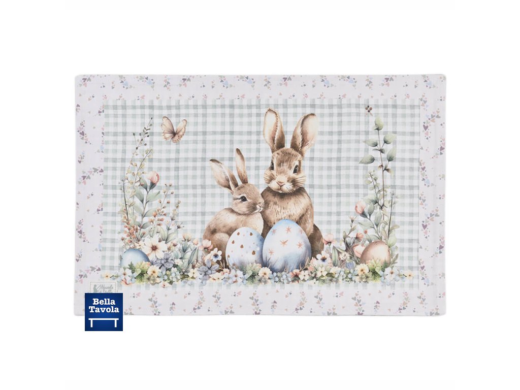 Veľkonočné prestieranie na stôl s motívom Zajačiky a vajíčka z kolekcie "Pepen" od talianskej značky Nuvole di Stoffa