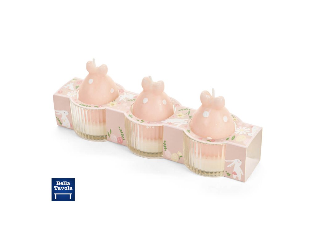 Sada 3 vonných sviečok Nuvole di Stoffa v tvare vajíčok s uškami v rafinovanom odtieni púdrovo-ružovej. Každá sviečka je umiestnená v elegantnom pohári z číreho skla a balená v ilustrovanom balení s veľkonočnou tematikou. Svieža citrusová vôňa. Kolekcia PePen.