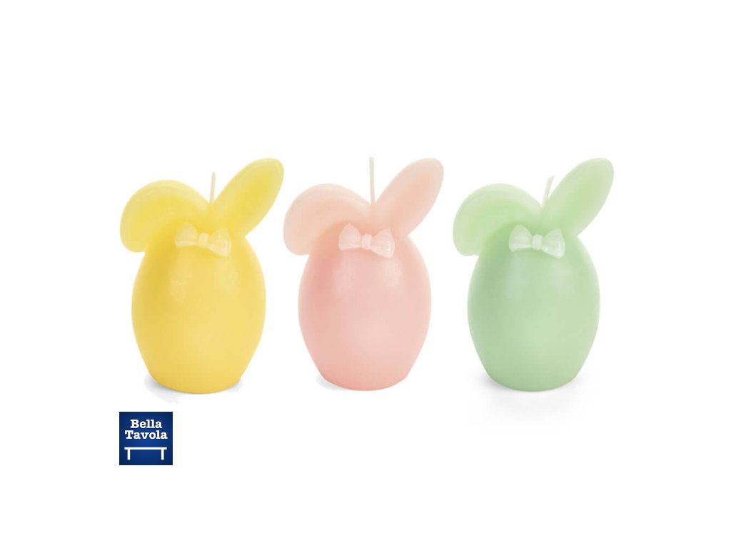 Sada 3 ks sviečok Nuvole di Stoffa v tvare vajíčka s uškami zajačika, vyrobená v jemných pastelových odtieňoch žltej, svetloružovej a šalviovo zelenej. Hladký matný povrch je zdobený malou reliéfnou mašľou na prednej strane. Veľmi pekná aj do jarných aranžmánov.