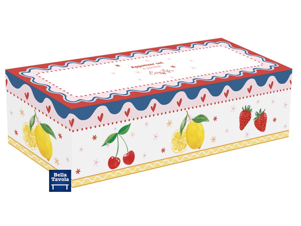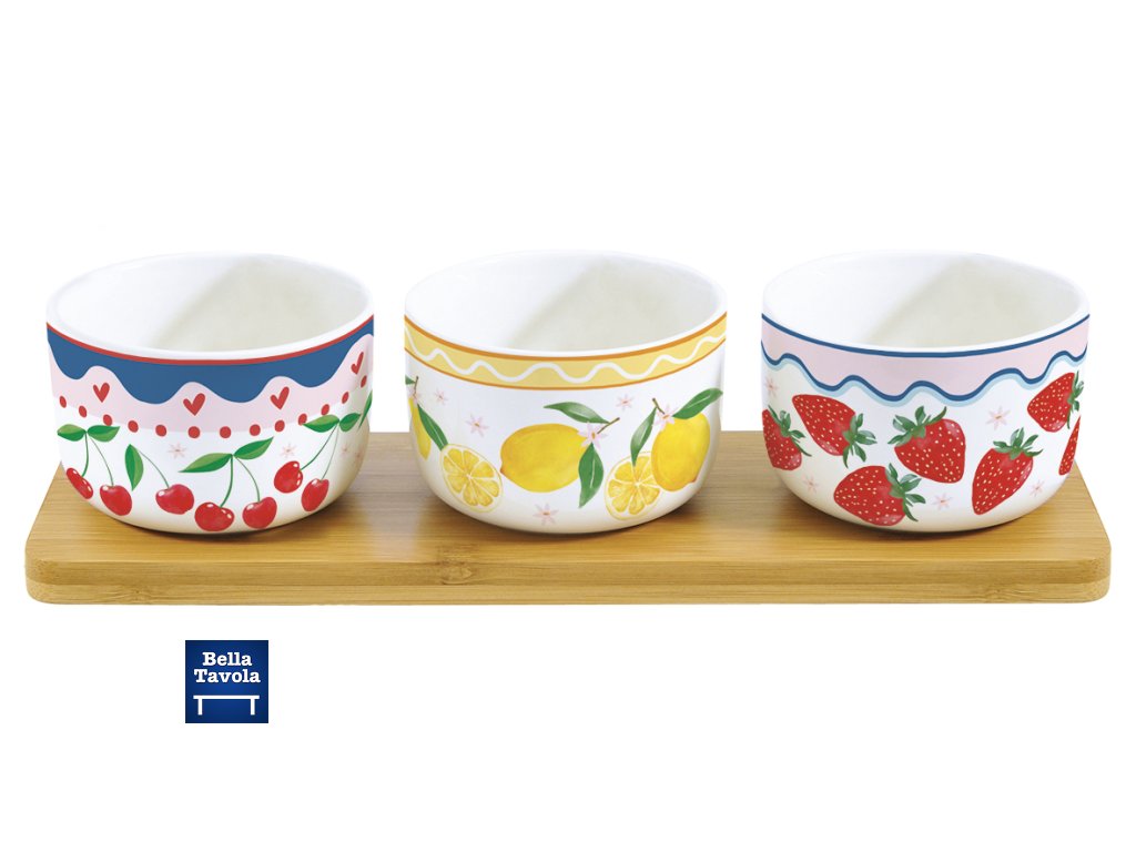 Servírovacia sada 3 porcelánových misiek s motívom ovocia na bambusovom podnose z kolekcie Fruit Mania od talianskej značky Easy Life. Vhodná na dipy, antipasti a predjedlá. V darčekovej krabičke.