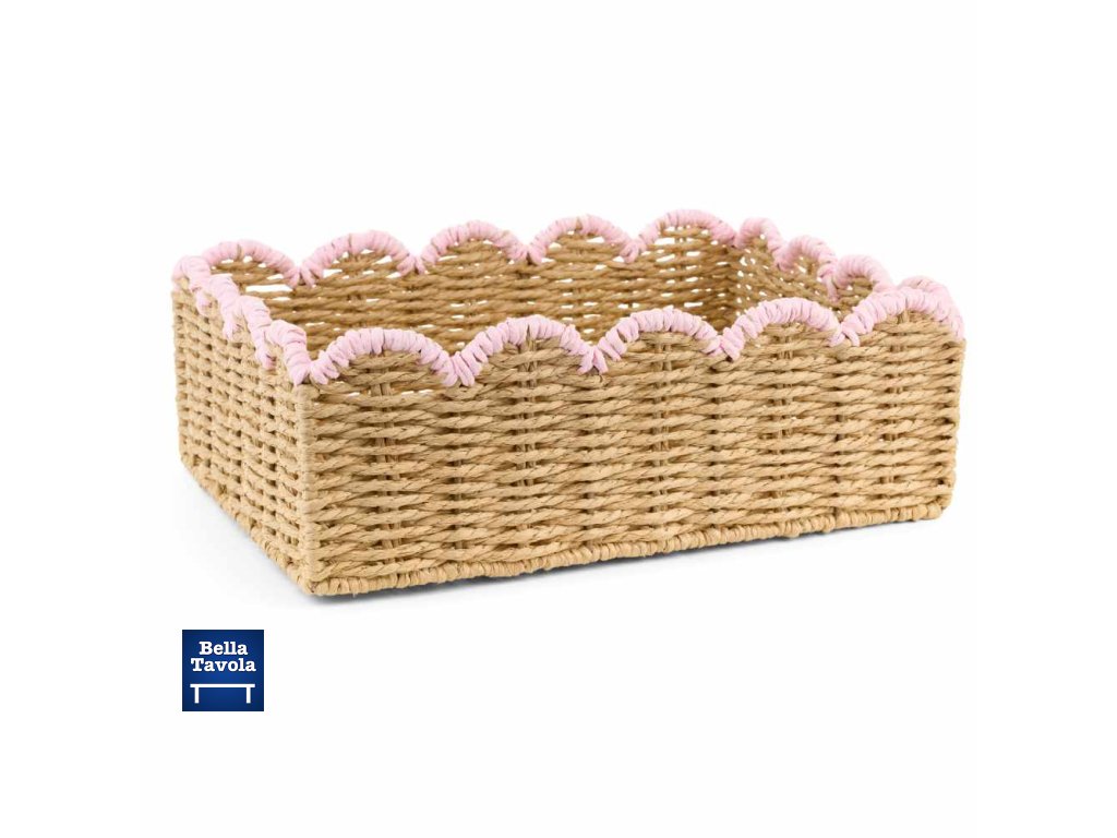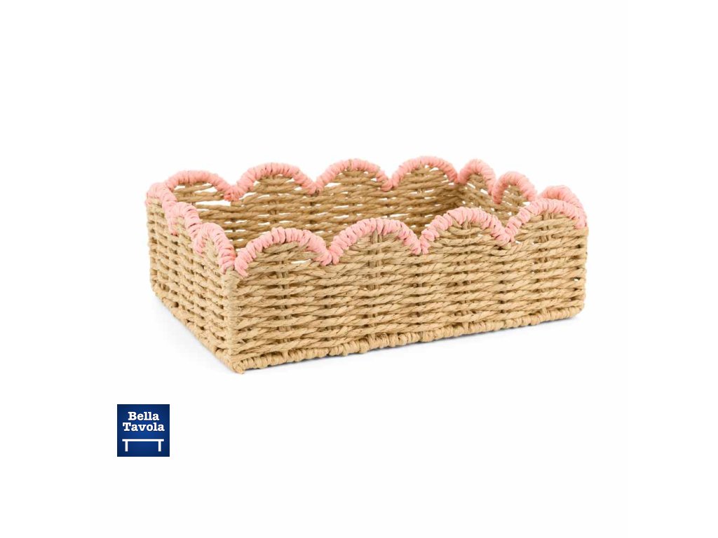 Obdĺžnikové košíky z prírodného tkaného ratanu s matným a textúrovaným povrchom. Vlnitý okraj je zakončený jemným a žiarivým látkovým lemom broskyňovej farby: ideálny na úložný priestor v štýle Shabby Chic kolekcia Fiorirà od značky Nuvole di Stoffa.
