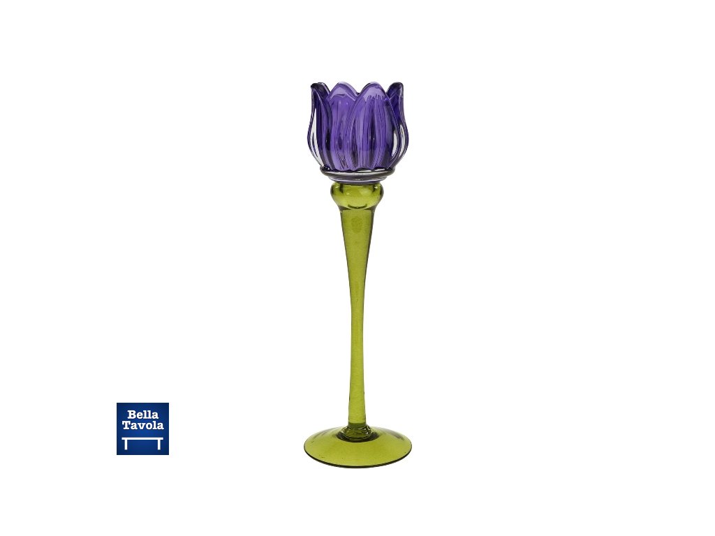 Sklenený svietnik na čajovú sviečku Tulipán 26 cm fialová. Nádherná jarná dekorácia.
