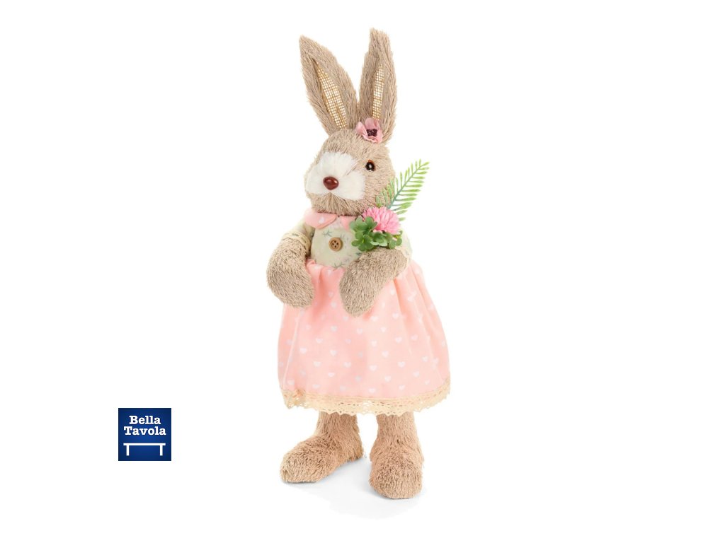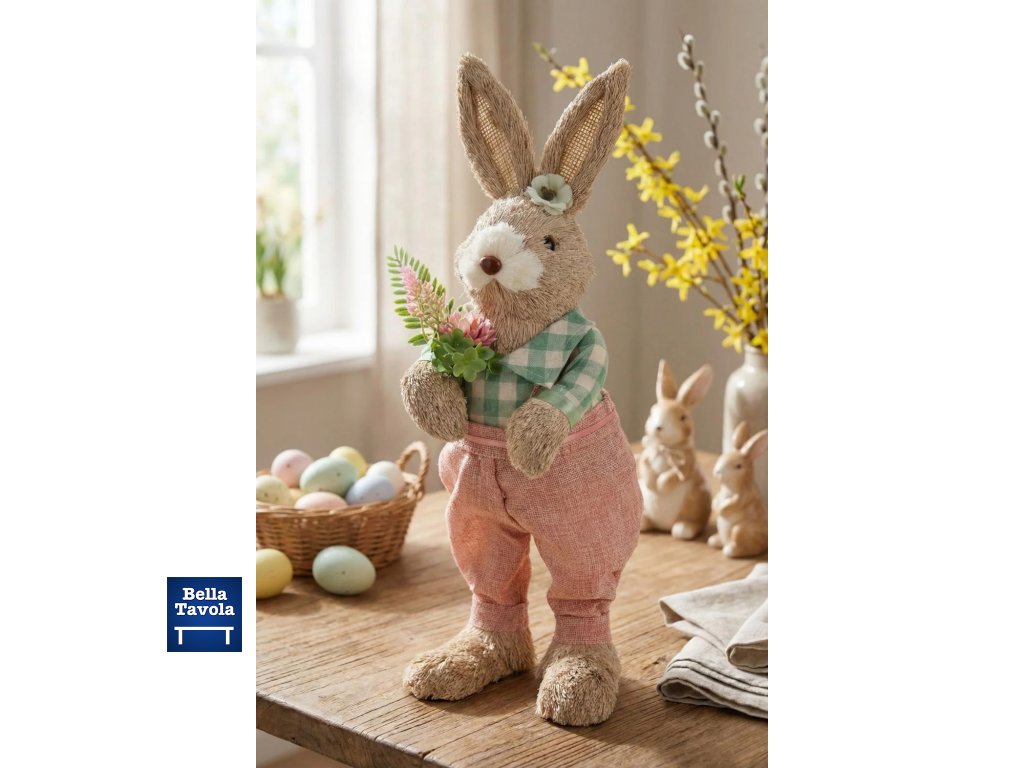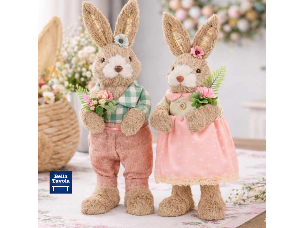 Dvojica ozdobných slamených zajačikov z kolekcie Pepen od talianskej značky Nuvole di Stoffa. Zajačik má na sebe šalviovo zelenú kockovanú košeľu a púdrovo ružové nohavice, má zelenú kyticu a ružové kvety. Zajačica má na sebe ružové šaty s bielymi srdiečkami , čipkovaným lemom a kvetinovým detailom na živôtiku, s malou kyticou a kvetom na uchu.