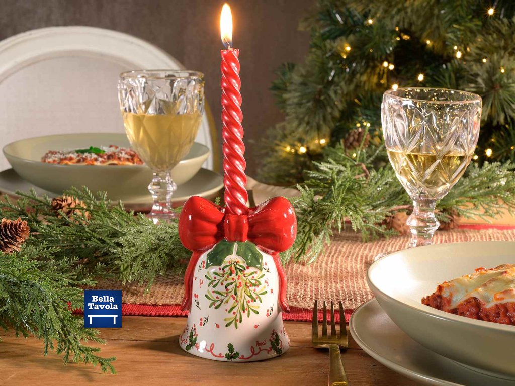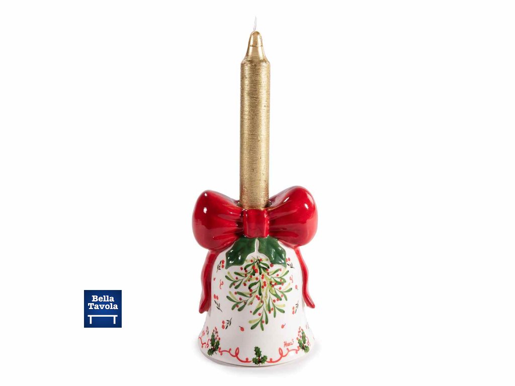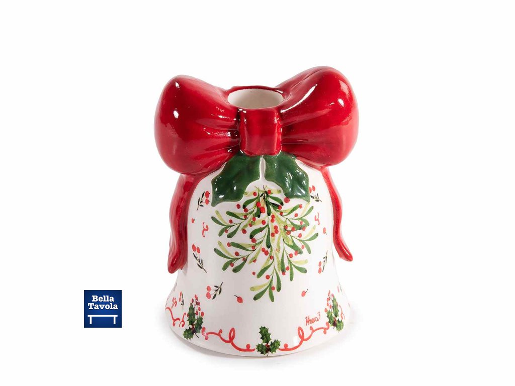 Vianočný keramický stojan na sviečku Zvonček s mašľou 10,5 cm