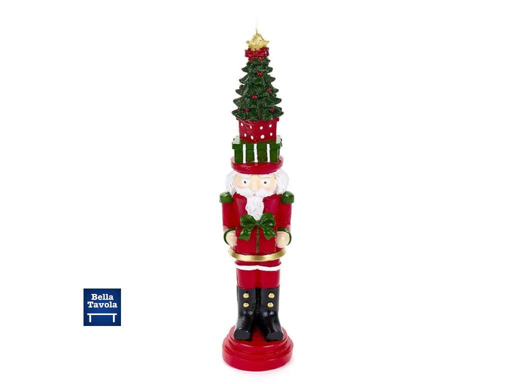 Dekoratívna vosková sviečka v tvare vianočného Luskáčika s červenými, zelenými a zlatými detailmi. Klobúk zdobí vianočný stromček s vrstvami darčekových krabičiek, všetko zdobené trblietkami a ručne maľovanými povrchovými úpravami.