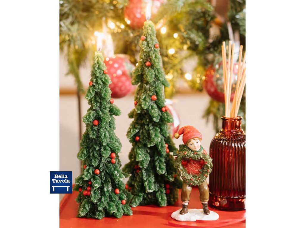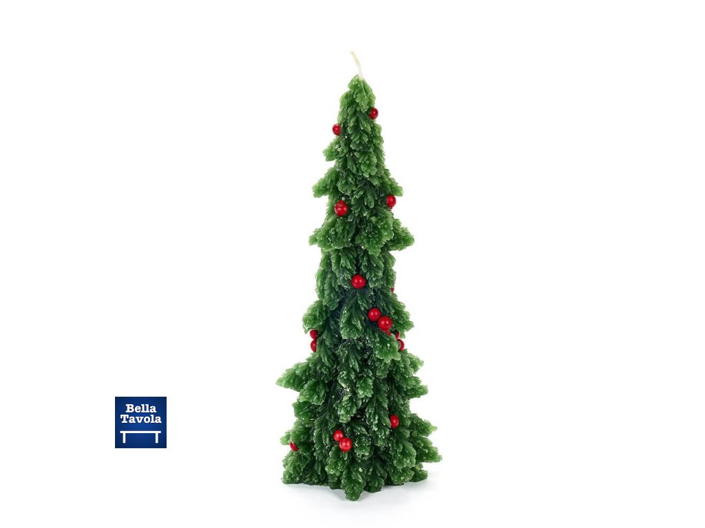Vosková sviečka v tvare vianočného stromčeka s vyrezávanými vetvičkami a vyvýšenými červenými bobuľami. Jedľovozelený odtieň s realistickými detailmi a jemným trblietavým povrchom. Ideálna na vkusné zdobenie vášho domova počas sviatkov.
