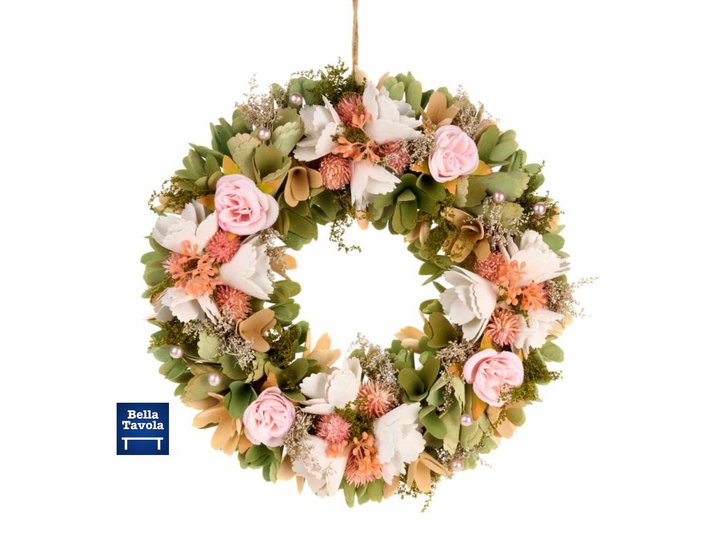 Dekoratívny veniec z kolekcie Fiorirà s dreveným podstavcom a bohatou kvetinovou kompozíciou: matne zelené listy, ružovo-ružové ruže, biele kvety a broskyňové akcenty, zdobené drobnými vetvičkami a malými, žiarivými perlami. Spolu so závesnou šnúrkou okamžite dodá romantický nádych dverám alebo stene.