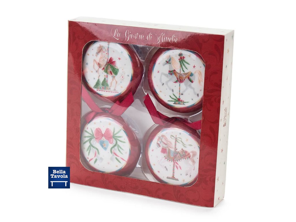 Sada 4 dekoratívnych vianočných medailónov s vintage ilustráciami. Vyrobené z lesklého materiálu s červenou stuhou a zodpovedajúcou darčekovou krabičkou. Rôzne motívy: hojdacie koníky, mašľa s modrým srdcom a slávnostné detaily.