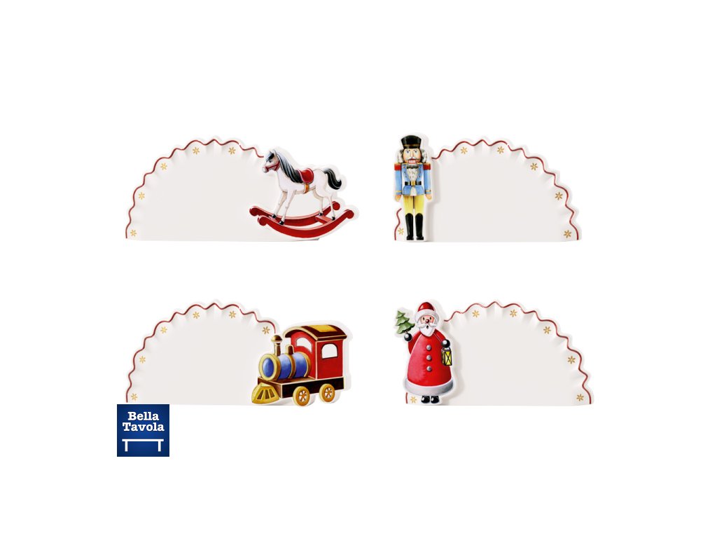 Vianočné porcelánové menovky set 4 ks s motívom Santa, Luskáčik, Hojdací koník a Lokomotíva z kolekcie Toy's Delight od Villeroy & Boch. Novinka 2026