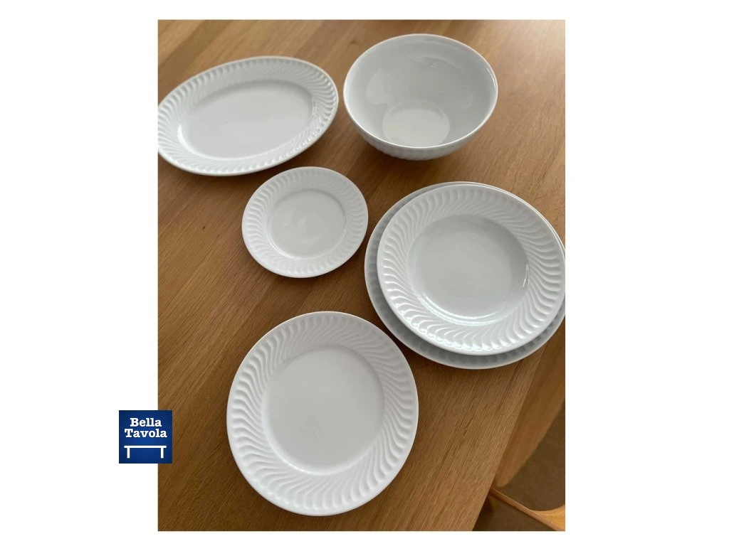 Porcelánový obedový servis 20 kusov pre 6 osôb Sagres od značky Vista Alegre zo série "First House" vhodný ako darček do novej domácnosti. Kolekcia Sagres predstavuje klasický a rafinovaný dizajn s reliéfnymi motívmi na okraji, ktoré tvoria jemnú vlnu evokujúcu more.
