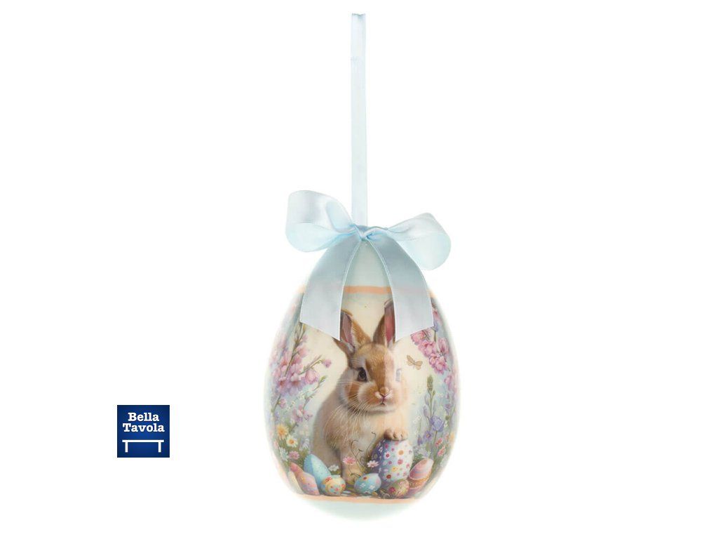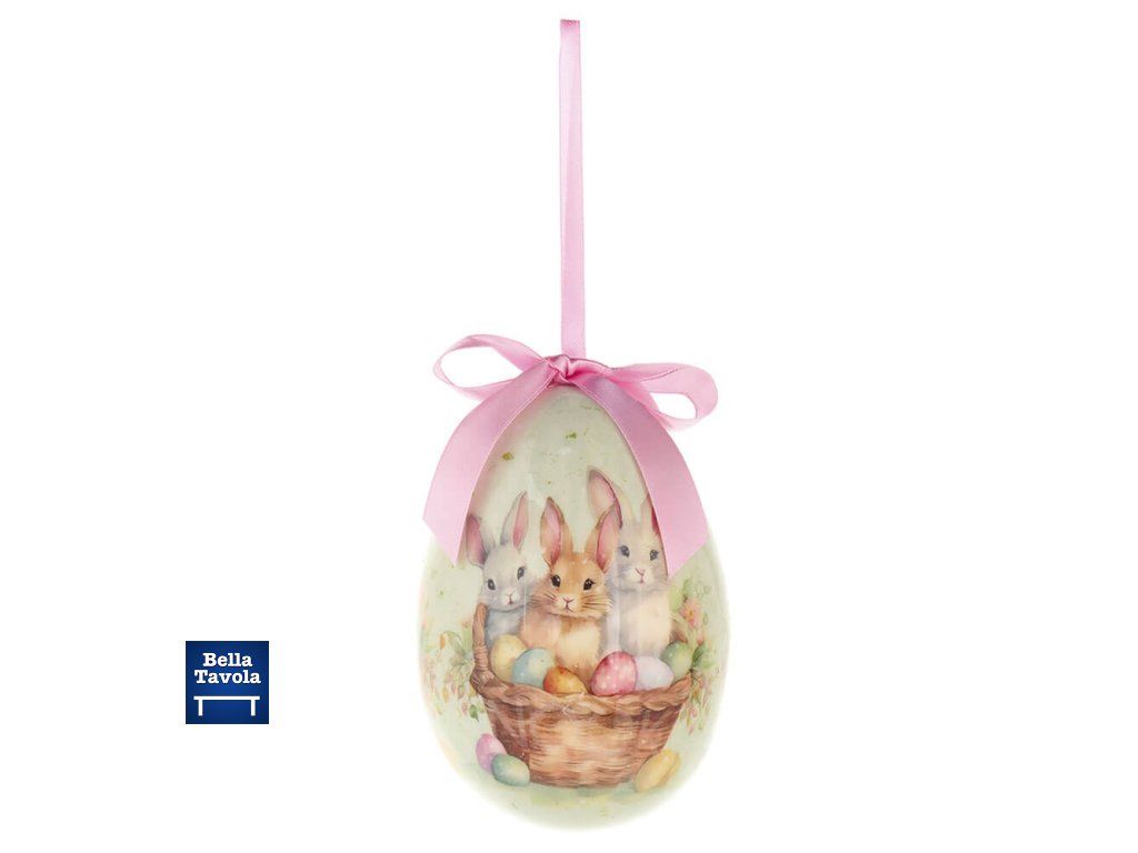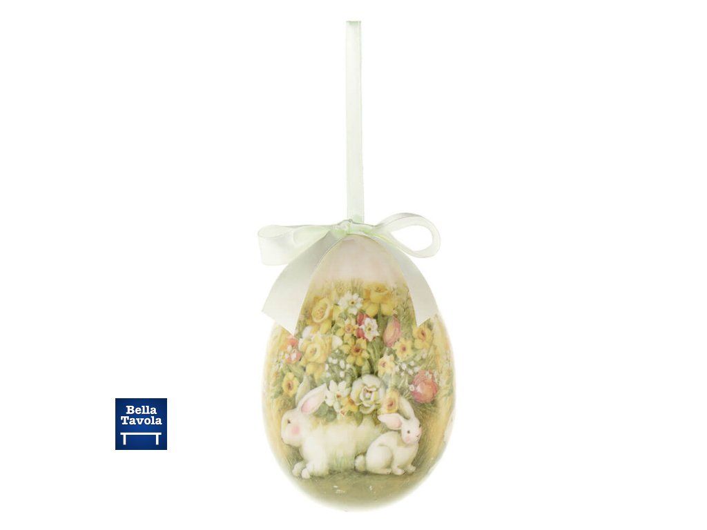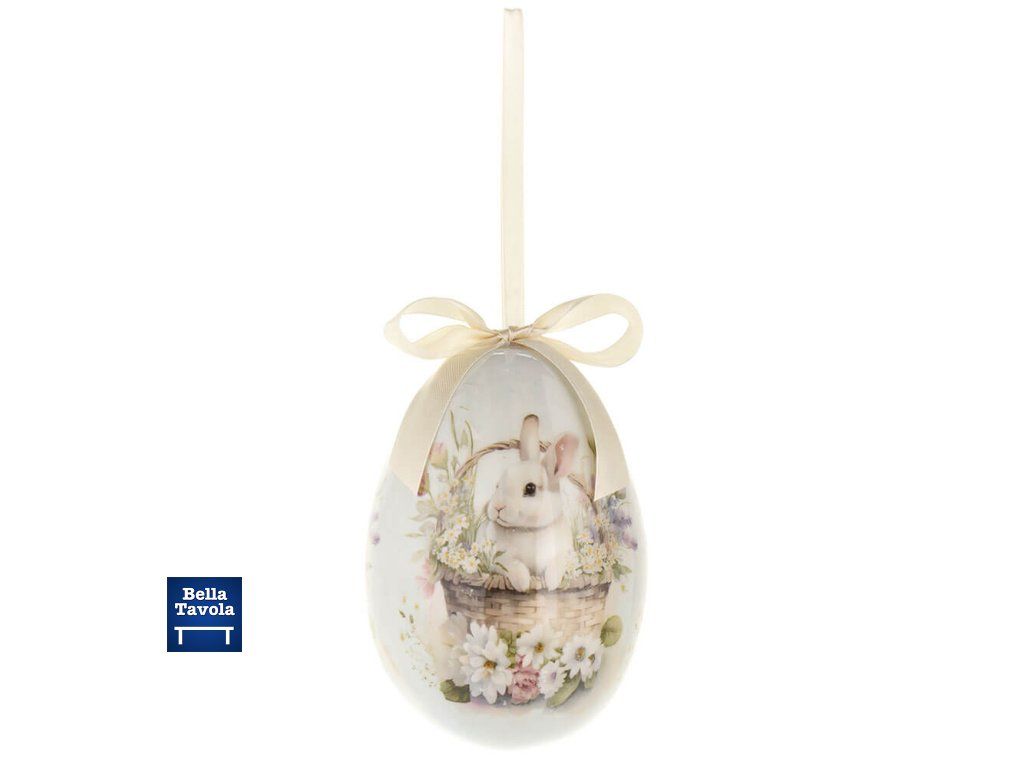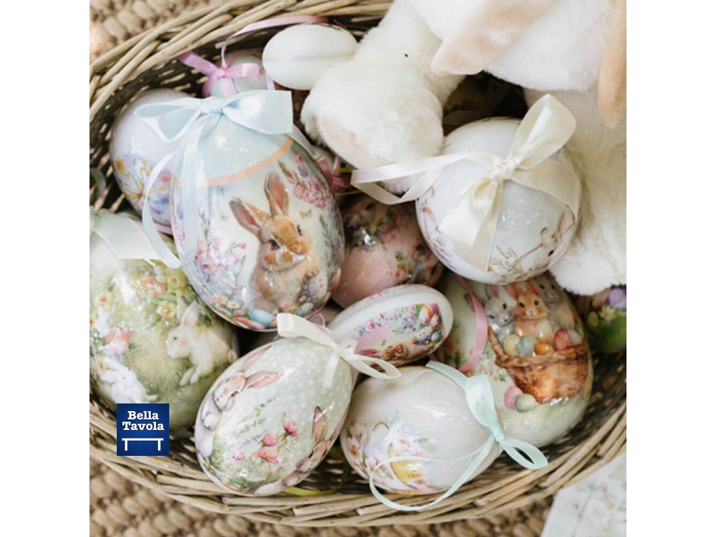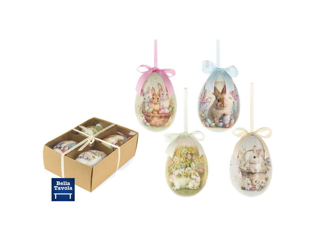 Sada 4 ks závesných veľkonočných vajíčok od značky Nuvole di Stoffa. Saténové stuhy umožňujú jednoduché zavesenie na konáre, vence alebo dekorácie. V darčekovej krabičke.